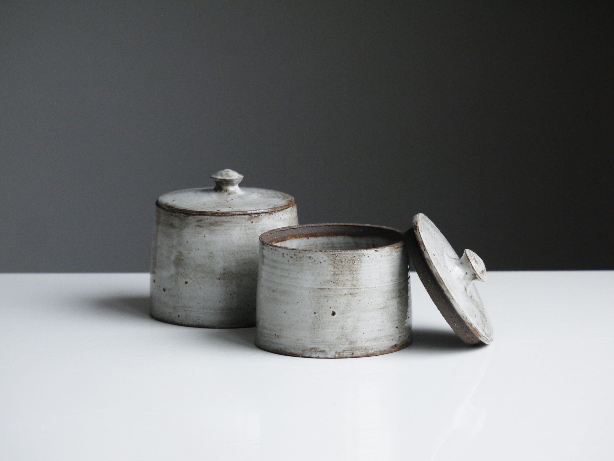 Ensemble de deux boîtes à sucre gris effet brut en céramique élaborées dans nos ateliers par des artisans qualifiés.